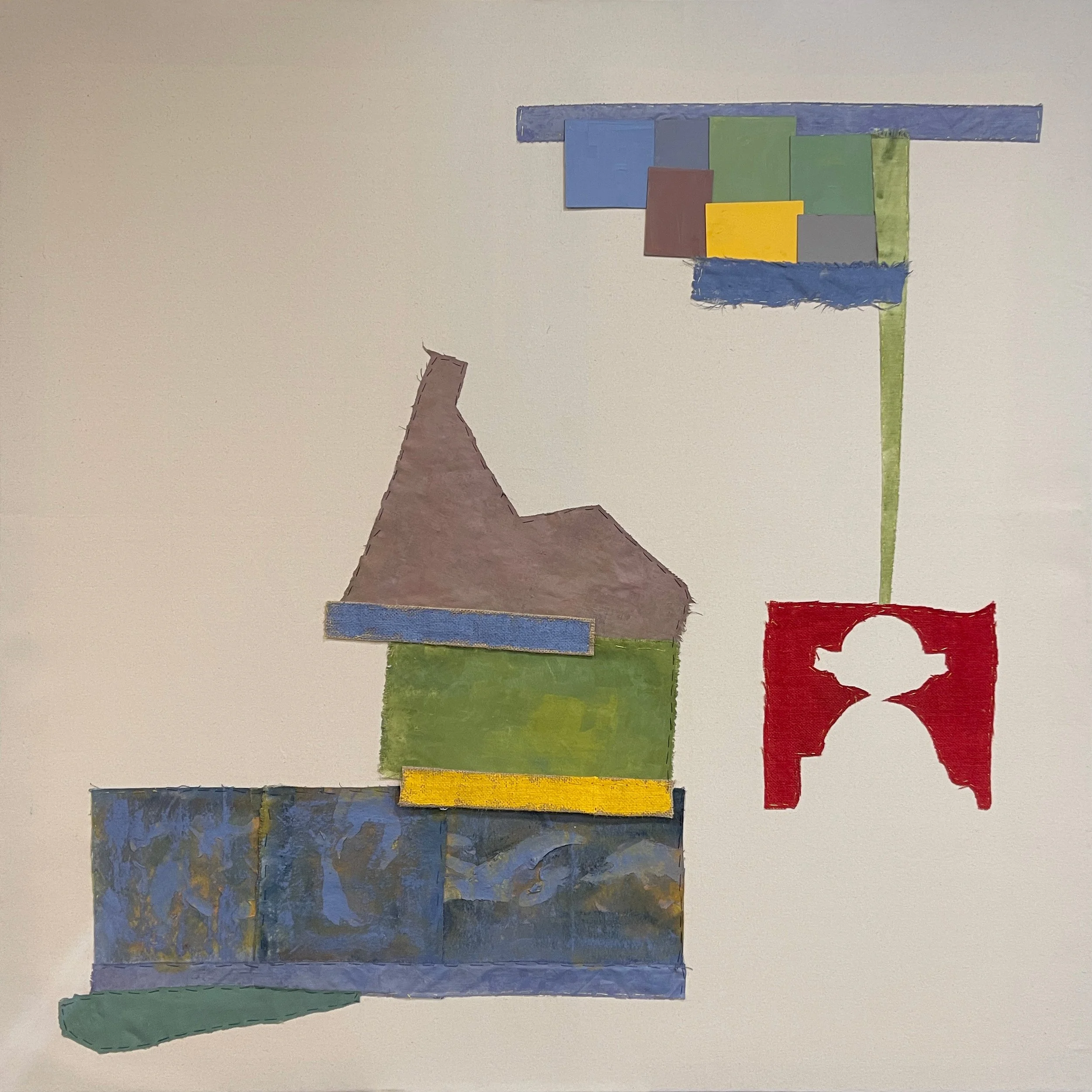 50” x 50” acrylic on canvas, acrylic on paper, and fabric collage, sewn and glued onto canvas.