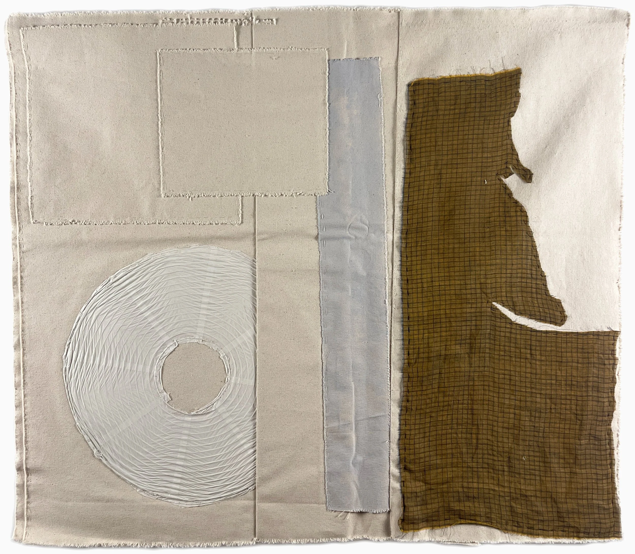 33” x 38” Canvas with acrylic paint, fabric, and found object, stitched together.